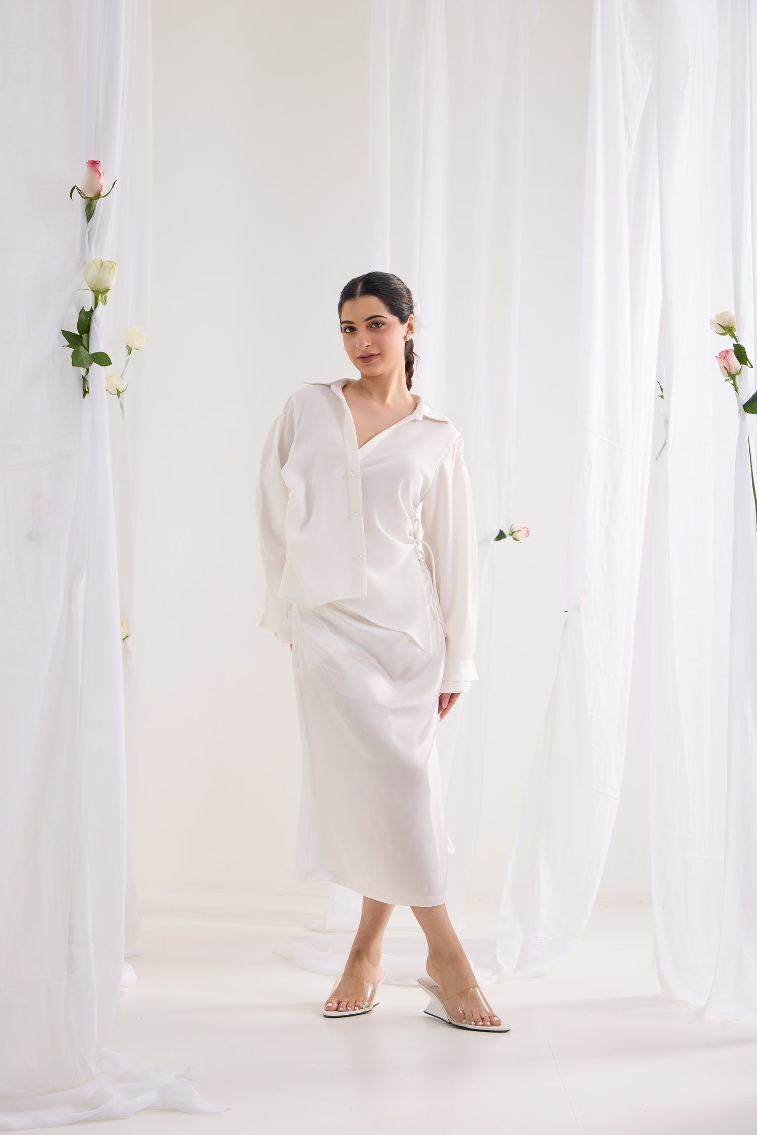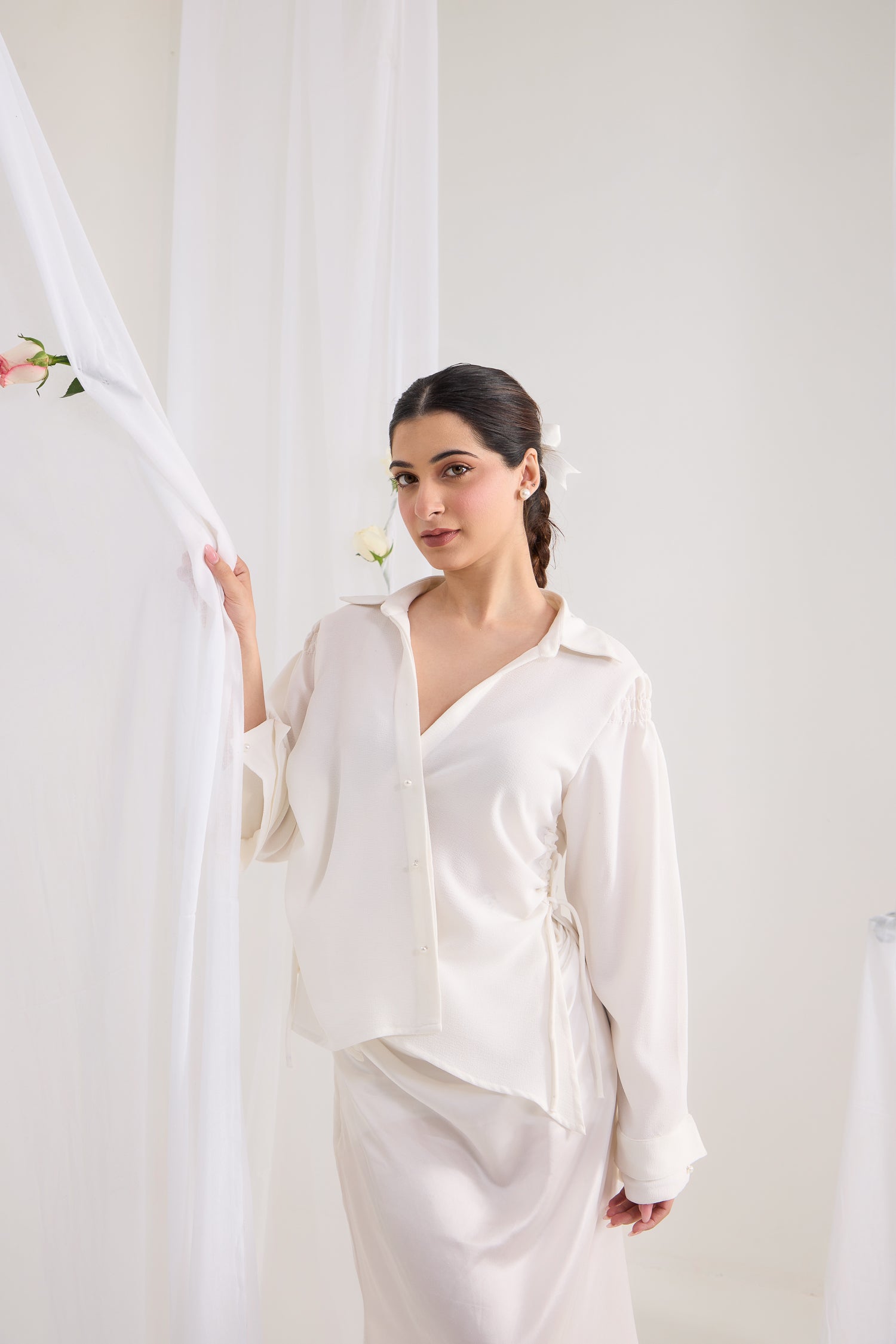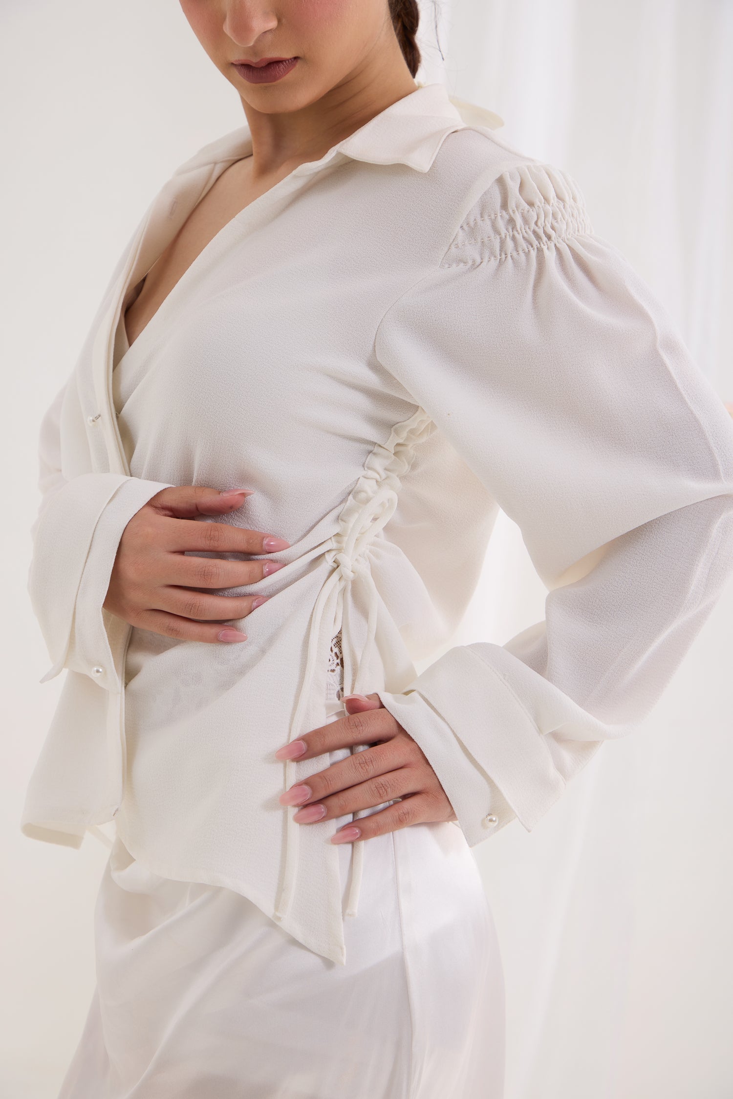 A softly structured wrap shirt designed with refined detailing and modern ease.