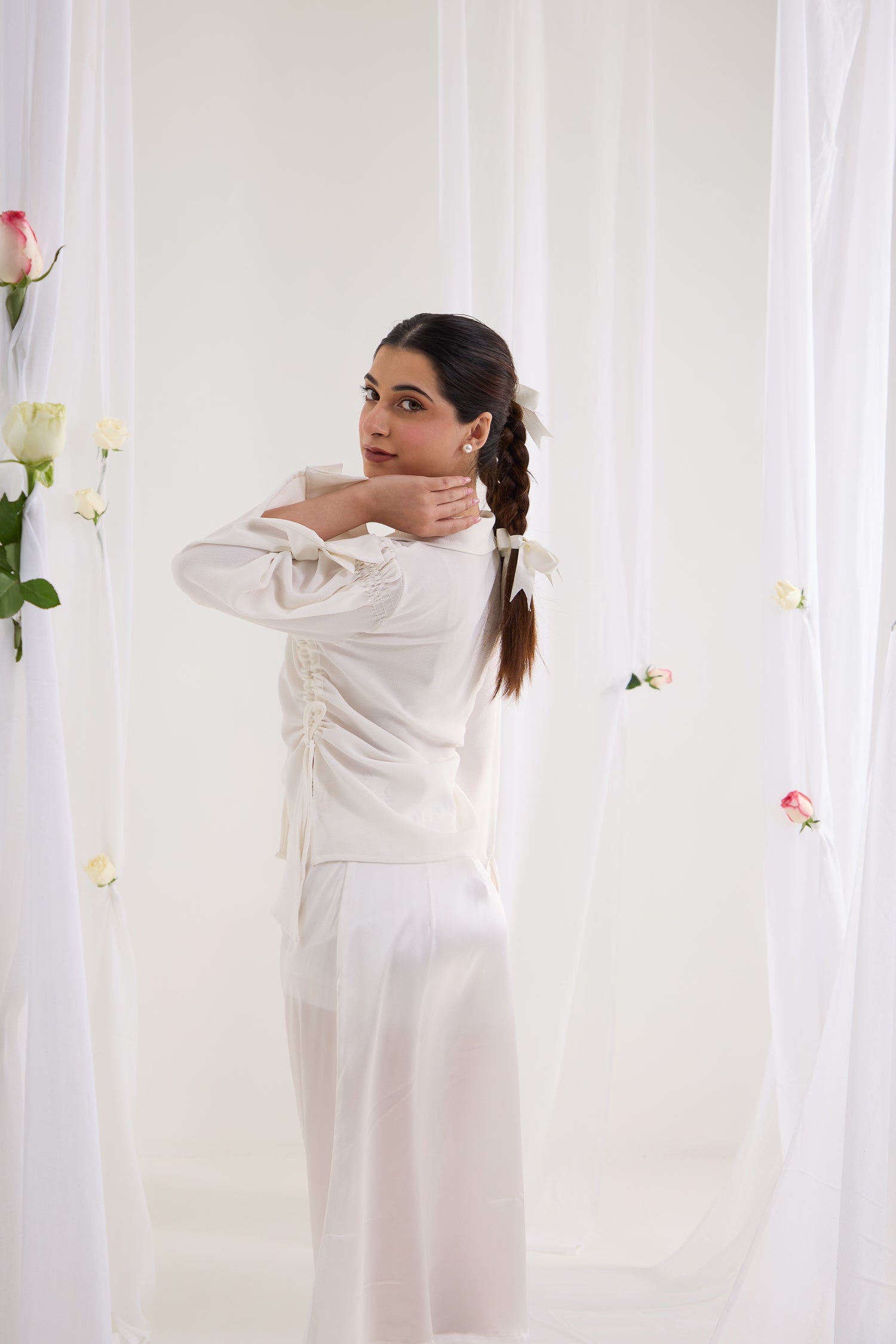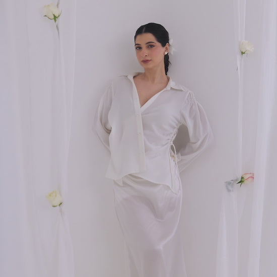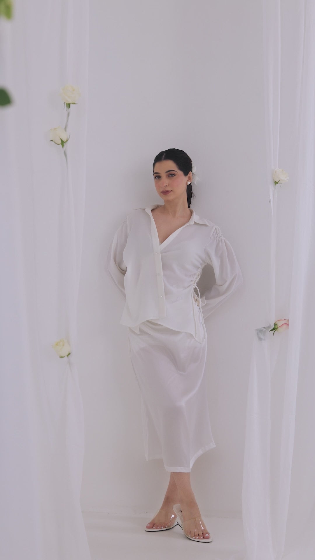 A softly structured wrap shirt designed with refined detailing and modern ease.